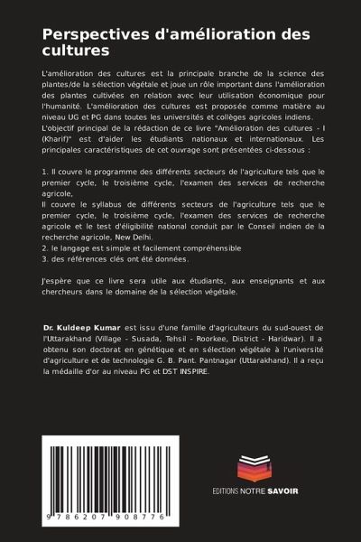 L'amélioration des cultures est la principale branche de la science des plantes/de la sélection végétale et joue un rôle important dans l'amélioration des plantes cultivées en relation avec leur utilisation économique pour l'humanité. L'amélioration des cultures est proposée comme matière au niveau UG et PG dans toutes les universités et collèges agricoles indiens.L'objectif principal de la rédaction de ce livre "Amélioration des cultures - I (Kharif)" est d'aider les étudiants nationaux et internationaux. Les principales caractéristiques de cet ouvrage sont présentées ci-dessous :1. Il couvre le programme des différents secteurs de l'agriculture tels que le premier cycle, le troisième cycle, l'examen des services de recherche agricole,Il couvre le syllabus de différents secteurs de l'agriculture tels que le premier cycle, le troisième cycle, l'examen des services de recherche agricole et le test d'éligibilité national conduit par le Conseil indien de la recherche agricole, New Delhi.2. le langage est simple et facilement compréhensible3. des références clés ont été données.J'espère que ce livre sera utile aux étudiants, aux enseignants et aux chercheurs dans le domaine de la sélection végétale.