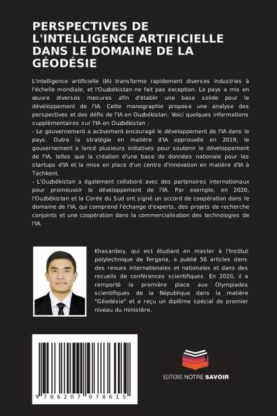 L'intelligence artificielle (IA) transforme rapidement diverses industries à l'échelle mondiale, et l'Ouzbékistan ne fait pas exception. Le pays a mis en oeuvre diverses mesures afin d'établir une base solide pour le développement de l'IA. Cette monographie propose une analyse des perspectives et des défis de l'IA en Ouzbékistan. Voici quelques informations supplémentaires sur l'IA en Ouzbékistan : - Le gouvernement a activement encouragé le développement de l'IA dans le pays. Outre la stratégie en matière d'IA approuvée en 2019, le gouvernement a lancé plusieurs initiatives pour soutenir le développement de l'IA, telles que la création d'une base de données nationale pour les startups d'IA et la mise en place d'un centre d'innovation en matière d'IA à Tachkent.- L'Ouzbékistan a également collaboré avec des partenaires internationaux pour promouvoir le développement de l'IA. Par exemple, en 2020, l'Ouzbékistan et la Corée du Sud ont signé un accord de coopération dans le domaine de l'IA, qui comprend l'échange d'experts, des projets de recherche conjoints et une coopération dans la commercialisation des technologies de l'IA.