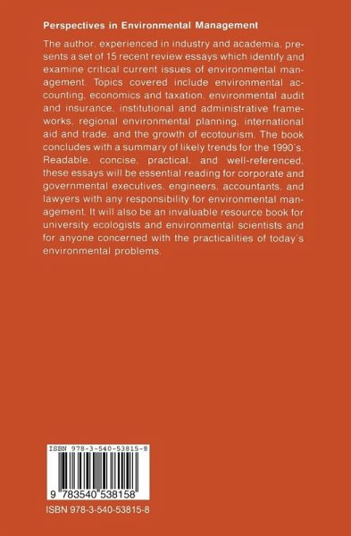 1 Critical Problems.- 2 Environmental Sensitivity Mapping: A Regional Planning Tool.- 3 Environmental Accounting: Techniques and Limitations.- 4 Equity, Public Resources and National Accounts.- 5 Economic Instruments of Environmental Policy.- 6 National Audit of Environmental Impact Predictions.- 7 Guidelines for Environmental Audit.- 8 Environmental Insurance.- 9 Shortcomings in Institutional Frameworks.- 10 The Role of Environmental Scientists.- 11 Environmental Research by the Private Sector.- 12 Environmental Planning and Policy for Green Tourism.- 13 Environmental Impacts of Recreation in Parks and Reserves.- 14 Environmental Implications of Development Aid.- 15 Trends in the 1990's.- Afterword.