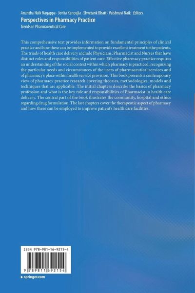This comprehensive text provides information on fundamental principles of clinical practice and how these can be implemented to provide excellent treatment to the patients. The triads of health care delivery include Physicians, Pharmacist and Nurses that have distinct roles and responsibilities of patient care. Effective pharmacy practice requires an understanding of the social context within which pharmacy is practiced, recognizing the particular needs and circumstances of the users of pharmaceutical services and of pharmacy's place within health service provision. This book presents a contemporary view of pharmacy practice research covering theories, methodologies, models and techniques that are applicable. The initial chapters describe the basics of pharmacy profession and what is the key role and responsibilities of Pharmacist in health care delivery. The central part of the book illustrates the community, hospital and ethics regarding drug formulation. The last chapters cover the therapeutic aspect of pharmacy and how these can be employed to improve patient's health care facilities.