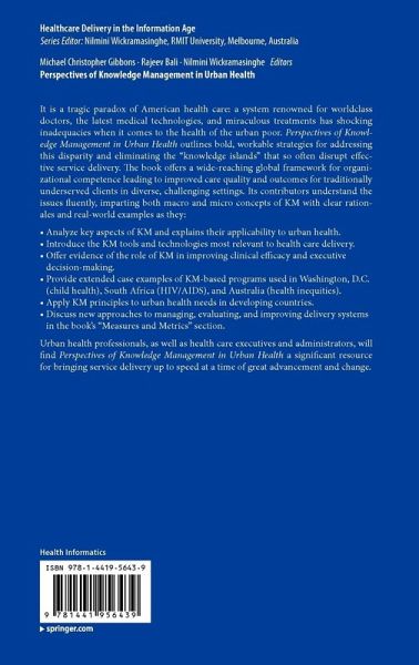 It is a tragic paradox of American health care: a system renowned for world-class doctors, the latest medical technologies, and miraculous treatments has shocking inadequacies when it comes to the health of the urban poor. Urban Health Knowledge Management outlines bold, workable strategies for addressing this disparity and eliminating the "knowledge islands" that so often disrupt effective service delivery. The book offers a wide-reaching global framework for organizational competence leading to improved care quality and outcomes for traditionally underserved clients in diverse, challenging settings. Its contributors understand the issues fluently, imparting both macro and micro concepts of KM with clear rationales and real-world examples as they:-Analyze key aspects of KM and explains their applicability to urban health.-Introduce the KM tools and technologies most relevant to health care delivery.-Offer evidence of the role of KM in improving clinical efficacy and executive decision-making.-Provide extended case examples of KM-based programs used in Washington, D.C. (child health), South Africa (HIV/AIDS), and Australia (health inequities).-Apply KM principles to urban health needs in developing countries.-Discuss new approaches to managing, evaluating, and improving delivery systems in the book's "Measures and Metrics" section.Urban health professionals, as well as health care executives and administrators, will find Urban Health Knowledge Management a significant resource for bringing service delivery up to speed at a time of great advancement and change.
