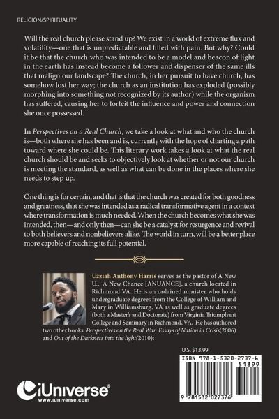 Will the real church please stand up? We exist in a world of extreme flux and volatility—one that is unpredictable and filled with pain. But why? Could it be that the church who was intended to be a model and beacon of light in the earth has instead become a follower and dispenser of the same ills that malign our landscape? The church, in her pursuit to have church, has somehow lost her way; the church as an institution has exploded (possibly morphing into something not recognized by its author) while the organism has suffered, causing her to forfeit the influence and power and connection she once possessed. In Perspectives on a Real Church, we take a look at what and who the church is—both where she has been and is, currently with the hope of charting a path toward where she could be. This literary work takes a look at what the real church should be and seeks to objectively look at whether or not our church is meeting the standard, as well as what can be done in the places where she needs to step up. One thing is for certain, and that is that the church was created for both goodness and greatness, that she was intended as a radical transformative agent in a context where transformation is much needed. When the church becomes what she was intended, then—and only then—can she be a catalyst for resurgence and revival to both believers and nonbelievers alike. The world in turn, will be a better place more capable of reaching its full potential.
