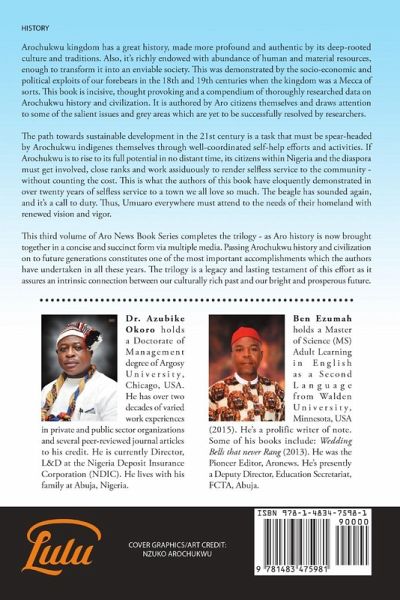 Arochukwu kingdom has a great history, made more profound and authentic by its deep-rooted culture and traditions. Also, it's richly endowed with abundance of human and material resources, enough to transform it into an enviable society. This was demonstrated by the socio-economic and political exploits of our forebears in the 18th and 19th centuries when the kingdom was a Mecca of sorts. This book is incisive, thought provoking and a compendium of thoroughly researched data on Arochukwu history and civilization. It is authored by Aro citizens themselves and draws attention to some of the salient issues and grey areas which are yet to be successfully resolved by researchers.