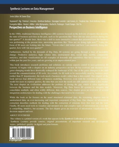 In the 1980s, traditional Business Intelligence (BI) systems focused on the delivery of reports that describe the state of business activities in the past, such as for questions like "How did our sales perform during the last quarter?" A decade later, there was a shift to more interactive content that presented how the business was performing at the present time, answering questions like "How are we doing right now?" Today the focus of BI users are looking into the future. "Given what I did before and how I am currently doing this quarter, how will I do next quarter?" Furthermore, fuelled by the demands of Big Data, BI systems are going through a time of incredible change. Predictive analytics, high volume data, unstructured data, social data, mobile, consumable analytics, and data visualization are all examples of demands and capabilities that have become critical within just the past few years, and are growing at an unprecedented pace. This book introduces research problems andsolutions on various aspects central to next-generation BI systems. It begins with a chapter on an industry perspective on how BI has evolved, and discusses how game-changing trends have drastically reshaped the landscape of BI. One of the game changers is the shift toward the consumerization of BI tools. As a result, for BI tools to be successfully used by business users (rather than IT departments), the tools need a business model, rather than a data model. One chapter of the book surveys four different types of business modeling. However, even with the existence of a business model for users to express queries, the data that can meet the needs are still captured within a data model. The next chapter on vivification addresses the problem of closing the gap, which is often significant, between the business and the data models. Moreover, Big Data forces BI systems to integrate and consolidate multiple, and often wildly different, data sources. One chapter gives an overview of several integration architectures for dealing with the challenges that need to be overcome. While the book so far focuses on the usual structured relational data, the remaining chapters turn to unstructured data, an ever-increasing and important component of Big Data. One chapter on information extraction describes methods for dealing with the extraction of relations from free text and the web. Finally, BI users need tools to visualize and interpret new and complex types of information in a way that is compelling, intuitive, but accurate. The last chapter gives an overview of information visualization for decision support and text.