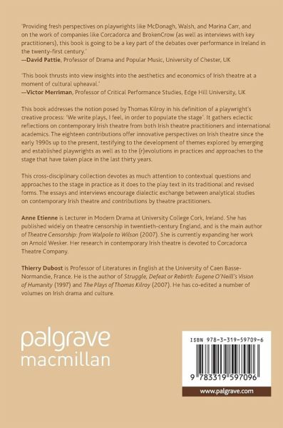 Foreword; Thomas Kilroy.- 1. Introduction; Anne Etienne and Thierry Dubost.- 2. Innovation meets Evocation: Tom Mac Intyre's plays at the Peacock Theatre; Marie Kelly.- 3. From Dementia to Utopia: Tragedy and Transcendence in Frank McGuinness' The Hanging Gardens; Matthieu Kolb.- 4. Women and Scarecrows: Marina Carr's Stage Bodies; Mary Noonan.- 5. McDonagh's True, Lonesome West; Maria Isabel Seguro.- 6. The physical and verbal theatre of Michael West; Nicholas Grene.- 7. A Dark Rosebud on the Irish Stage: Ailís Ní Ríain's Tallest Man in the World; Thierry Dubost.- 8. Death of A Playwright; Geoff Gould.- 9. Looking back and forward on sound design: Irish theatre transformed; Cormac O'Connor.- 10. Lightning in a Bottle: the BrokenCrow Experiment; Ronan FitzGibbon.- 11. Interview with Bríd Ó Gallchoir; Anne Etienne and Thierry Dubost.- 12. Interview with Pat Kinevane; Anne Etienne.- 13. Interview with Mark O'Rowe; Thierry Dubost and Anne Etienne.- 14. Enda Walsh, in conversation with Ger FitzGibbon.- 15. Slump and Punk in Ray Scannell's Losing Steam: Envisioning Corcadorca; Anne Etienne.- 16. Through A Glass, Darkly: Priests on the Contemporary Irish Stage; Virginie Roche-Tiengo.- 17. Populating the Irish Stage with (Dis)Abled Bodies: Sanctuary by Christian O'Reilly and the Blue Teapot Company; Katarzyna Ojrzynska.- 18. Queering the Irish Stage: Shame, Sexuality, and the Politics of Testimonial; Cormac O'Brien.- 19. A Gendered Absence: Feminist theatre, Glasshouse Productions, and the #WTF movement; Patricia O'Beirne.
