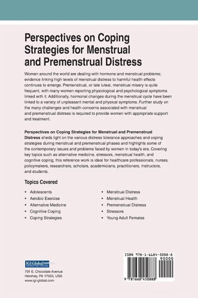 Women around the world are dealing with hormone and menstrual problems; evidence linking high levels of menstrual distress to harmful health effects continues to emerge. Premenstrual, or late luteal, menstrual misery is quite frequent, with many women reporting physiological and psychological symptoms linked with it. Additionally, hormonal changes during the menstrual cycle have been linked to a variety of unpleasant mental and physical symptoms. Further study on the many challenges and health concerns associated with menstrual and premenstrual distress is required to provide women with appropriate support and treatment. Perspectives on Coping Strategies for Menstrual and Premenstrual Distress sheds light on the various distress tolerance approaches and coping strategies during menstrual and premenstrual phases and highlights some of the contemporary issues and problems faced by women in today's era. Covering key topics such as alternative medicine, stressors, menstrual health, and cognitive coping, this reference work is ideal for healthcare professionals, nurses, policymakers, researchers, scholars, academicians, practitioners, instructors, and students.