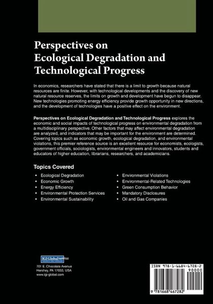 In economics, researchers have stated that there is a limit to growth because natural resources are finite. However, with technological developments and the discovery of new natural resource reserves, the limits on growth and development have begun to disappear. New technologies promoting energy efficiency provide growth opportunity in new directions, and the development of technologies have a positive effect on the environment. Perspectives on Ecological Degradation and Technological Progress explores the economic and social impacts of technological progress on environmental degradation from a multidisciplinary perspective. Other factors that may affect environmental degradation are analyzed, and indicators that may be important for the environment are determined. Covering topics such as economic growth, ecological degradation, and environmental violations, this premier reference source is an excellent resource for economists, ecologists, government officials, sociologists, environmental engineers and innovators, students and educators of higher education, librarians, researchers, and academicians.