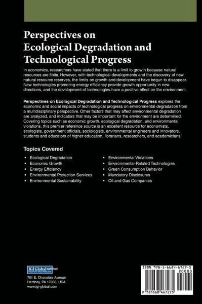 In economics, researchers have stated that there is a limit to growth because natural resources are finite. However, with technological developments and the discovery of new natural resource reserves, the limits on growth and development have begun to disappear. New technologies promoting energy efficiency provide growth opportunity in new directions, and the development of technologies have a positive effect on the environment. Perspectives on Ecological Degradation and Technological Progress explores the economic and social impacts of technological progress on environmental degradation from a multidisciplinary perspective. Other factors that may affect environmental degradation are analyzed, and indicators that may be important for the environment are determined. Covering topics such as economic growth, ecological degradation, and environmental violations, this premier reference source is an excellent resource for economists, ecologists, government officials, sociologists, environmental engineers and innovators, students and educators of higher education, librarians, researchers, and academicians.