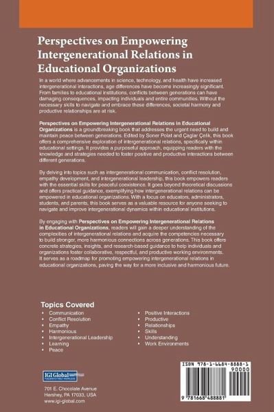 Perspectives on Empowering Intergenerational Relations in Educational Organizations is a groundbreaking book that addresses the urgent need to build and maintain peace between generations. Edited by Soner Polat and Çaglar Çelik from Kocaeli University, Turkey, this comprehensive exploration delves into intergenerational relations within educational settings, equipping readers with the knowledge and strategies needed to foster positive interactions between different generations. From intergenerational communication and conflict resolution to empathy development and leadership, this book empowers individuals with the essential skills for peaceful coexistence. With a focus on practical guidance and real-life examples, Perspectives on Empowering Intergenerational Relations in Educational Organizations offers valuable insights for educators, administrators, students, and parents. It serves as a valuable resource for navigating and improving intergenerational dynamics within educational institutions. By engaging with this book, readers gain a deeper understanding of the complexities of intergenerational relations and acquire the competencies necessary to build stronger, more harmonious connections across generations. Through concrete strategies and research-based guidance, it provides a roadmap for promoting empowering intergenerational relations, paving the way for a more inclusive and harmonious future in educational organizations.