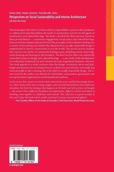 Foreword by Tim Costello.- 1. An introduction to social sustainability and interior architecture, by Dianne Smith, Sarah Beeck, Marina Lommerse, Priya Metcalfe.- Part I. Community Engagement and Interior Architecture .- 2. Working together: interior architecture creating with the community, by Marina Lommers.- 3. More than bricks and mortar: lessons in design and world citizenship, by Kelley Beaverford.- Part II. Social Justice and Interior Architecture .- 4. Interiors can address Social Justice: fact or fiction? By Dianne Smith.- 5. The importance of interior design professionals' engagement in policy development to effect change for underprivileged individuals, by Jill Pable and Lisa Waxman .- 6. Interior design by expediency, by Rodney Harber and Angela Buckland.- 7. Inside the remote-area Aboriginal house, by Paul Memmott.- 8. Too 'nice' to be socially responsible: reflections of a Danish interior practitioner, by Marianne Frandsen.- Part III. Cultural Heritage and Interior Architecture .- 9. Cultural Heritage practice through socially sustainable adaptive re-use of industrial buildings: a Western Australian narrative, by Priya Metcalfe.- 10. Ambiguity and permeability in historic Modern interiors: a challenge for Cultural Heritage and social sustainability, by Penny Sparke .