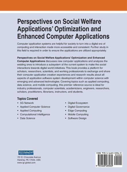 Computer application systems are helpful for society to turn into a digital era of computing and interaction made more accessible and consistent. Further study in this field is required in order to ensure the applications are utilized appropriately. Perspectives on Social Welfare Applications' Optimization and Enhanced Computer Applications discusses new computer applications and analyzes the existing ones to introduce a subsystem of the current system to make the social interactions towards digital world initiatives. This book provides a platform for scholars, researchers, scientists, and working professionals to exchange and share their computer application creation experiences and research results about all aspects of application software system development within computer science with emerging and advanced technologies. Covering topics such as applied computing, data science, and mobile computing, this premier reference source is ideal for industry professionals, computer scientists, academicians, engineers, researchers, scholars, practitioners, librarians, instructors, and students.