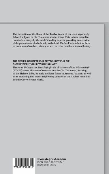 The formation of the Book of the Twelve is one of the most vigorously debated subjects in Old Testament studies today. This volume assembles twenty-four essays by the world's leading experts, providing an overview of the present state of scholarship in the field. The book's contributors focus on questions of method, history, as well as redactional and textual history.