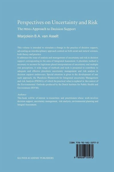 It addresses the issue of analysis and management of uncertainty and risk in decision support corresponding to the aims of Integrated Assessment. A pluralistic method is necessary to account for legitimate plural interpretations of uncertainty and multiple risk perceptions. A wide range of methods and tools is presented to contribute to adequate and effective pluralistic uncertainty management and risk analysis in decision support endeavours. Special attention is given to the development of one such approach, the Pluralistic fRamework for Integrated uncertainty Management and risk Analysis (PRIMA), of which the practical value is explored in the context of the Environmental Outlooks produced by the Dutch Institute for Public Health and Environment (RIVM).
