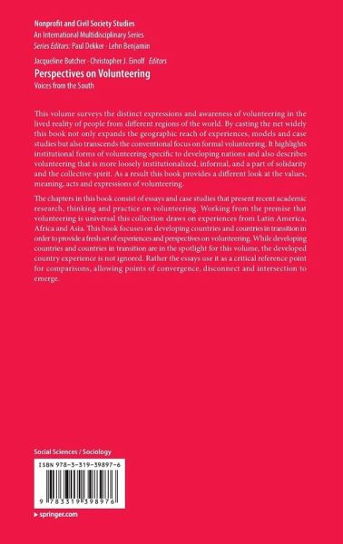 Part I: Volunteering: An Introduction and Theoretical Framework.- 1: Volunteering: A Complex Social Phenomenon.- Part II: Cross-national Approaches.- 2. The Economic Value of Volunteering: Comparative Estimates among Developing, Transitional, and Developed Countries.- 3. Perceptions of Volunteering and Their Effect on Sustainable Development and Poverty alleviation in Mozambique, Nepal and Kenya.- 4. The Role of Civic Service in Enhancing Youth Employability: Reflections on National Youth Programmes in Sub-Saharan Africa.- 5. Corporate Volunteering in the Global South.- 6. The Value of Volunteers in Community-Based Organisations: Insights from Southern Africa.- 7. Models, Developments and Effects of Trans-Border Youth Volunteer Exchange Programmes in Eastern and Southern Africa.- Part III: Country studies.- 8. Global Solidarity: Learning from Volunteer Frameworks in Peru.- 9. Beyond Images and Perceptions: Conceptualizing and Measuring Volunteerism in Buenos Aires.- 10. Solidarity and Volunteering: A View from Mexico.- 11. Volunteerism and the State: Understanding the Development of Volunteering in China.- 12. Volunteering in Armenia: Leaving the Soviet Legacy Behind?.- 13. The Current State of Volunteering in Turkey.- Part IV: Conclusion.- Conclusion.