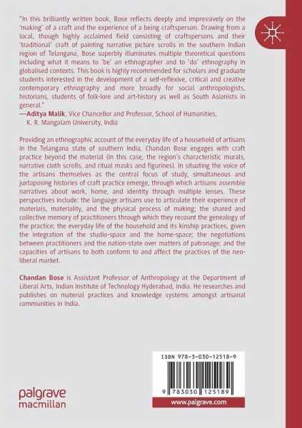 Providing an ethnographic account of the everyday life of a household of artisans in the Telangana state of southern India, Chandan Bose engages with craft practice beyond the material (in this case, the region's characteristic murals, narrative cloth scrolls, and ritual masks and figurines). In situating the voice of the artisans themselves as the central focus of study, simultaneous and juxtaposing histories of craft practice emerge, through which artisans assemble narratives about work, home, and identity through multiple lenses. These perspectives include: the language artisans use to articulate their experience of materials, materiality, and the physical process of making; the shared and collective memory of practitioners through which they recount the genealogy of the practice; the everyday life of the household and its kinship practices, given the integration of the studio-space and the home-space; the negotiations between practitioners and the nation-state over matters of patronage; and the capacities of artisans to both conform to and affect the practices of the neo-liberal market.