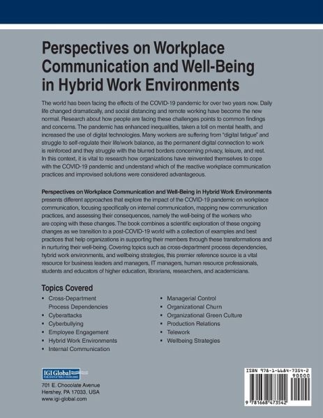 The world has been facing the effects of the COVID-19 pandemic for over two years now. Daily life changed dramatically, and social distancing and remote working have become the new normal. Research about how people are facing these challenges points to common findings and concerns. The pandemic has enhanced inequalities, taken a toll on mental health, and increased the use of digital technologies. Many workers are suffering from "digital fatigue" and struggle to self-regulate their life/work balance, as the permanent digital connection to work is reinforced and they struggle with the blurred borders concerning privacy, leisure, and rest. In this context, it is vital to research how organizations have reinvented themselves to cope with the COVID-19 pandemic and understand which of the reactive workplace communication practices and improvised solutions were considered advantageous. Perspectives on Workplace Communication and Well-Being in Hybrid Work Environments presents different approaches that explore the impact of the COVID-19 pandemic on workplace communication, focusing specifically on internal communication, mapping new communication practices, and assessing their consequences, namely the well-being of the workers who are coping with these changes. The book combines a scientific exploration of these ongoing changes as we transition to a post-COVID-19 world with a collection of examples and best practices that help organizations in supporting their members through these transformations and in nurturing their well-being. Covering topics such as cross-department process dependencies, hybrid work environments, and wellbeing strategies, this premier reference source is a vital resource for business leaders and managers, IT managers, human resource professionals, students and educators of higher education, librarians, researchers, and academicians.