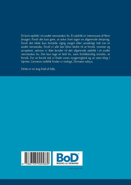 Et kort øjeblik i et andet menneskes liv. Et øjeblik er interessant af flere årsager. Fordi det kangøre, at selve livet tager en afgørende drejning. Fordi det både kan fortælle rigtig meget eller uendeligt lidt om et andet menneske. Fordi vi alle bør blive bedre til at forstå, rumme og acceptere, selvom vi ikke kender til det afgørende øjeblik i et andet menneskes liv. Det kan tage et helt liv, men forhåbentlig mindre, at forstå. For at forstå må vi finde vores nysgerrighed og at være klog i hjertet. Gennem indblik finder vi indsigt. Dernæst udsyn. Dette er en bog fuld af håb.