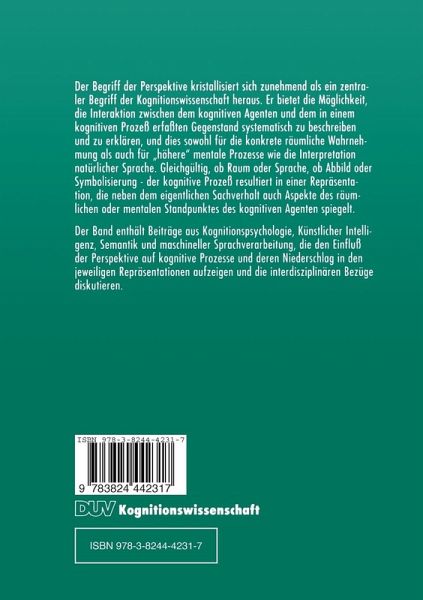 Priming als Maß für das räumliche Gedächtnis.- Analogizität und Perspektive in räumlichen mentalen Modellen.- Zur Wahl des repräsentierten Raumausschnitts beim Aufbau mentaler Modelle während der Textrezeption.- Objektzugriff in Mentalen Modellen: Eine Frage der Perspektive.- Modellierung räumlicher Inferenzen durch Graphen mit symbolischen und numerischen Constraints.- Räumliche Repräsentation im diagrammatischen Schließen.- Aspektkarten - Integriert räumlich-symbolische Repräsentationsstrukturen.- Repräsentations-Metonymie, Perspektive und Koordination in aufgabenorientierten Dialogen.- Zur Dynamik kontextueller Konzepte.- Interpretationssteuerung - Apposition und Typisierung.- Relativierung, Perspektivierung, Beschränkung: als und wie.- Perspektive und propositionale Einstellung in der Semantik von kommen.- Perspektive in der Semantik von Wahrnehmungsverben.- Perspektiven in der dynamischen Semantik.- Adressen der Autorinnen.
