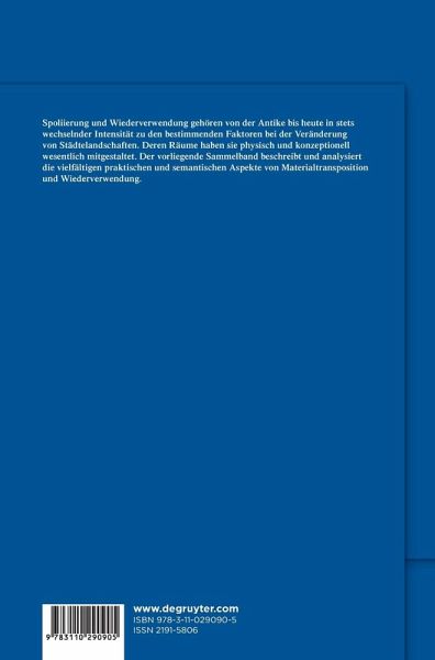 Spoliierung und Wiederverwendung gehören von der Antike bis heute in stets wechselnder Intensität zu den bestimmenden Faktoren bei der Veränderung von Städtelandschaften. Deren Räume haben sie physisch und konzeptionell wesentlich mitgestaltet. Der vorliegende Sammelband beschreibt und analysiert die vielfältigen praktischen und semantischen Aspekte von Materialtransposition und Wiederverwendung.