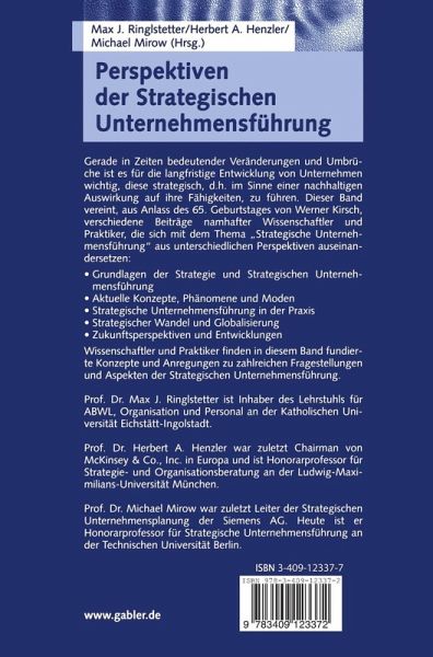 Prof. Dr. Max J. Ringlstetter ist Inhaber des Lehrstuhls für ABWL, Organisation und Personal an der Katholischen Universität Eichstätt-Ingolstadt. Prof. Dr. Herbert A. Henzler war zuletzt Chairman von McKinsey & Co., Inc., in Europa und ist Honorarprofessor für Strategie- und Organisationsberatung an der Ludwig-Maximilians-Universität München. Prof. Dr. Michael Mirow war zuletzt Leiter der Strategischen Unternehmensplanung der Siemens AG. Heute ist er Honorarprofessor für Strategische Unternehmensführung an der Technischen Universität Berlin.