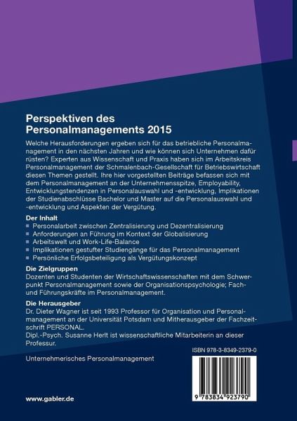 Personalmanagement an der Unternehmensspitze.- Die Personalarbeit im Spannungsfeld zwischen Zentralisierung und Dezentralisierung - aus Praxissicht.- Die Personalarbeit im Spannungsfeld zwischen Zentralisierung und Dezentralisierung - konzeptionelle Überlegungen.- Personalmanagement 2015 - Praktische Anforderungen und strategische Aktionsfelder.- "Global leadership made in Germany?".- Gefährliche Rationalität wertorientierter Managementkonzepte.- Employability.- Employability.- Innovationen in der Arbeitswelt und Auswirkungen auf die Work-Life-Balance.- Work-Life-Balance in der Institution "Hochschule".- Entwicklungstendenzen in der Personalauswahl und -entwicklung.- Entwicklungstendenzen der Personalbeschaffung und -auswahl.- Entwicklungstendenzen der Personalentwicklung - Personalentwicklung 2015.- Veränderungen im Personalgeschäft aus Praxissicht.- Entwicklungstendenzen in der Personalauswahl und -entwicklung.- Implikationen der Studienabschlüsse Bachelor und Master auf die Personalauswahl und -entwicklung.- Implikationen der Studienabschlüsse Bachelor und Master für die Personalbeschaffung und -auswahl.- Implikationen gestufter Studiengänge für das Personalmanagement.- Personalentwicklung als verlängertes Studium?!.- Vergütung.- Arbeitszeit- und Vergütungskonzepte 2015.- Moderne Vergütungskonzepte.- Arbeitsmarkt 2015 - Auswirkungen auf die Vergütungskonzepte durch Änderungen in der Gesellschafterstruktur und gesetzliche Neuregelung.- Vergütungsmanagement in Zeiten des Shareholder-Wechsels.
