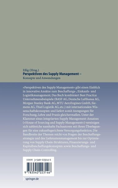 Perspektiven des Supply Management gibt einen Einblick in innovative Ansätze zum Beschaffungs-, Einkaufs- und Logistikmanagement. Das Buch kombiniert Best Practice-Unternehmensbeispiele (BASF AG, Deutsche Lufthansa AG, Morgan Stanley Bank AG, MTU AeroEngines GmbH, Siemens AG, Thiel Logistik AG, etc.) mit internationalen Wissenschaftskonzepten und liefert somit Anregungen für Forschung, Lehre und Praxis gleichermaßen. Unter der Klammer eines integrierten Supply Management-Ansatzes ("House of Sourcing and Supply Management") vereinigen sich zahlreiche namhafte Fachautoren mit ihren Überlegungen für eine zukunftsgerichtete Versorgungsfunktion. Die Bandbreite der Themen reicht von Fragen der Beschaffungsstrategie und des Lieferantenmanagement bis zur Optimierung von Supply Chain-Strukturen, Finanzierungs- und Kapitalbeschaffungskonzepten sowie Beschaffungs- und Supply Chain-Controlling.