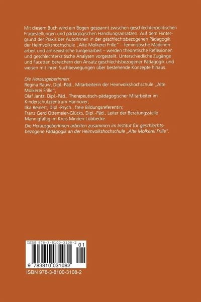 Mit diesem Buch wird ein Bogen gespannt zwischen geschlechterpolitischen Fragestellungen und pädagogischen Handlungsansätzen. Auf dem Hintergrund der Praxis der AutorInnen in der geschlechtsbezogenen Pädagogik der Heimvolkshochschule "Alte Molkerei Frille"- feministische Mädchenarbeit und antisexistische Jugendarbeit- werden theoretische Reflexionen und geschlechterkritische Analysen vorgestellt. Unterschiedliche Zugänge und Facetten bereichern den Ansatz geschlechterbezogener Pädagogik und weisen mit ihren Suchbewegungen über bestehende Konzepte hinaus.