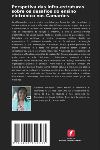 As dificuldades com o ensino em linha nos Camarões são complexas e incluem muitos aspectos diferentes das infra-estruturas do país. O acesso a plataformas e recursos de aprendizagem em linha é limitado devido à falta de fiabilidade da ligação à Internet, o que é particularmente problemático nas zonas rurais. Tanto os alunos como os professores têm dificuldade em participar no ensino eletrónico contínuo devido ao agravamento do problema causado por um fornecimento de energia inadequado e por interrupções frequentes. Outro grande problema do ensino eletrónico é o facto de poucas pessoas terem acesso a computadores, tablets e software modernos. A execução dos programas de eLearning é dificultada pela falta de instalações físicas adequadas, entre as quais salas de aula, bibliotecas e laboratórios informáticos. Para ultrapassar estes obstáculos, será necessário um esforço combinado de organizações públicas e privadas. Além disso, é essencial investir em fontes de energia mais fiáveis, numa melhor ligação à Internet e no acesso aos recursos de software e hardware necessários. Para melhorar o acesso a um ensino de qualidade nos Camarões, é necessário adotar e utilizar eficazmente o e-learning. Este livro baseia-se na minha investigação de mestrado.