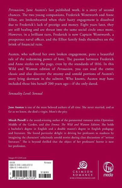 Persuasion, Jane Austen's final published work, is a story of second chances. A very young Frederick Wentworth and Anne Elliot are broken-hearted when their hasty engagement is dissolved due to Frederick's lack of prestige and lack of money. Eight years later, they are still healing when they are thrust into the same social circle once more - however, in a brilliant turn, now Frederick is Captain Wentworth, a prosperous naval officer, and the Elliot family finds themselves on the brink of financial ruin. Austen, who suffered her own broken engagement, pens a beautiful tale of the redeeming power of love, and the passion between Frederick and Anne sizzles on the page, even by the standards of 1816. In this wild and wanton edition of Persuasion, read the entire classic and discover the steamy untold portions of Austen's story that have been lying dormant in the subtext. Who knows, Austen may have included these bits herself 200 years ago - if only she dared. Sensuality Level: Sensual