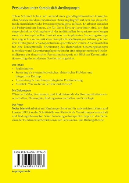 Tobias Schmohl befasst sich anhand einer grundlagentheoretisch-konzeptuellen Analyse mit dem rhetorischen Steuerungsbegriff, auf dem das klassische fundamentalrhetorische Persuasionsparadigma aufbaut. Er arbeitet zunächst die Basisprämissen heraus, die für dieses Konzept konstitutiv sind, um den eingeschränkten Geltungsbereich der traditionellen Persuasionsvorstellungen sowie die konzeptionellen Limitationen der implizierten Steuerungskonzeption angesichts kommunikativer Komplexitätsbedingungen aufzuzeigen. Vor dem Hintergrund der autopoietischen Systemtheorie werden Anschlussstellen für eine konzeptionelle Erweiterung des rhetorischen Steuerungskonzepts identifiziert und Orientierungshypothesen für eine programmatische Neuformulierung der rhetorischen Persuasionskategorie mit Blick auf Kommunikationssettings der modernen Gesellschaft abgeleitet.