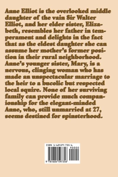 Anne Elliot is the overlooked middle daughter of the vain Sir Walter Elliot, and her elder sister, Elizabeth, resembles her father in temperament and delights in the fact that as the eldest daughter she can assume her mother's former position in their rural neighborhood. Anne's younger sister, Mary, is a nervous, clinging woman who has made an unspectacular marriage to the heir to a bucolic but respected local squire. None of her surviving family can provide much companionship for the elegant-minded Anne, who, still unmarried at 27, seems destined for spinsterhood.