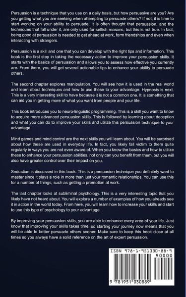 *Caution* This book contains powerful psychological techniques to influence anyone at will... Buy this book at your own risk. Persuasion is a technique that you use on a daily basis, but how persuasive are you? Are you getting what you are seeking when attempting to persuade others? If not, it is time to start working on your ability to persuade. It is often thought that persuasion, and the techniques that fall under it, are only used for selfish reasons, but this is not true. In fact, being good at persuasion is needed to get ahead at work, form friendships and even when interacting with strangers. Persuasion is a skill and one that you can develop with the right tips and information. This book is the first step in taking the necessary action to improve your persuasion skills. It starts with the basics of persuasion and allows you to assess how effective you currently are. From there, you will get several actionable tips to enhance your ability to persuade others. The second chapter explores manipulation. You will see how it is used in the real world and learn about techniques and how to use these to your advantage. Hypnosis is next. This is a very interesting skill to have because it is not a common one. It is something that can aid you in getting more of what you want from people and your life. This book introduces you to neuro-linguistic programming. This is a skill you want to know to acquire more advanced persuasion skills. This is followed by learning about deception and what you can do to improve your skills and utilize this persuasion technique to your advantage. Mind games and mind control are the next skills you will learn about. You will be surprised about how these are used in everyday life. In fact, you likely fall victim to them quite regularly in ways you are not even aware of. When you know the basics and how to utilize these to enhance your persuasion abilities, not only can you benefit from them, but you will also have greater control over their impact on you. Seduction is discussed in this book. This is a persuasion technique you definitely want to master since it plays a role in more than just your romantic relationships. You can use this for a number of things, such as getting a promotion at work. The last chapter looks at subliminal psychology. This is a very interesting topic that you likely have not heard about. You will explore a number of examples of how you already see it in action in the world today. From here, you will learn how to increase your skills and start to use this type of psychology to your advantage. By improving your persuasion skills, you are able to enhance every area of your life. Just know that improving your skills takes time, so starting your journey now means that you will be able to better persuade others sooner. Make sure to keep this book close at all times so you always have a solid reference on the art of expert persuasion.
