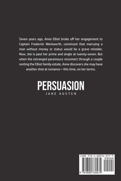 Do you want to read Persuasion? If so then keep reading... Seven years ago, Anne Elliot broke off her engagement to Captain Frederick Wentworth, convinced that marrying a man without money or status would be a grave mistake. Now, she is past her prime and single at twenty-seven. But when the estranged paramours reconnect through a couple renting the Elliot family estate, Anne discovers she may have another shot at romance-this time, on her terms. What are you waiting for Persuasion is one click away, select the "Buy Now" button in the top right corner NOW!