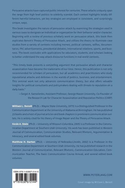 This book investigates the nature of persuasive attack by examining the strategies used in various cases to denigrate an individual or organization for their behavior and/or character. Beginning with a review of previous scholarly work on persuasive attack, this book then explicates Benoit's Theory of Persuasive Attack, and utilizes the theory to illuminate case studies from a variety of contexts including memes, political cartoons, selfies, documentaries, PAC advertisements, presidential debates, international relations, sports, and business. The book concludes with applications for educators, students, and scholars looking to better understand the way attack discourse functions in real world contexts.
