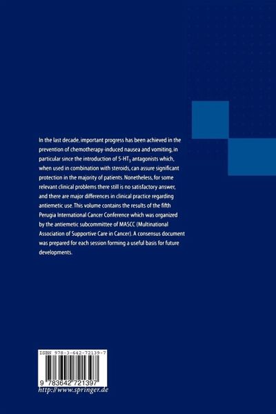 In the last decade, important progress has been achieved in the prevention of chemotherapy-induced nausea and vomiting, in particular since the introduction of 5-HT3 antagonists which, when used in combination with steroids, can assure significant protection in the majority of patients. Nonetheless, for some relevant clinical problems there still is no satisfactory answer, and there are major differences in clinical practice regarding antiemetic use. This volume contains the results of the fifth Perugia International Cancer Conference which was organized in 8 sessions, a consensus document was prepared for each session forming a useful basis for future developments.