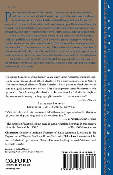 Peruvian author Ricardo Palma (1838-1919) was one of the most popular and imitated writers in Latin America during the late nineteenth and early twentieth centuries. Ironic and witty anecdotes about conquerors, viceroys, corrupt and lovelorn friars, tragic loves and notorious characters.