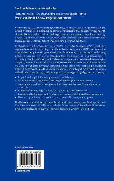 Part I: Why Pervasive Healthcare and KM?.- Part I Introduction.- Chapter 1.Pervasive Computing and Healthcare.- Chapter 2. Implicit and Explicit Knowledge Assets in Healthcare.- Chapter 3. Regulating Pervasive e-Health Services.- Chapter 4. e-Health Complexity and Actor-Network Theory.- Chapter 5. e-health trends.- Part II: KM and Pervasive Health.- Part II Introduction: Making sense of Pervasive Healthcare: the Role of Knowledge Management.- Chapter 6. Managing Knowledge in Crisis Scenarios: the Use of Pervasive Technologies.- Chapter 7. The Analysis and Design of a Pervasive Health Record: Perspectives from Malaysia.- Chapter 8. Quality analysis of Sensors Data for Personal Health Records on Mobile devices.- Chapter 9. Smartphone Application Design and Knowledge Management for People with Demintia.- Part III: The INET Solution and Diabetes Self-Care.- Part III Introduction: Critical Perspectives on a Possible Solution.- Chapter 10. A Pervasive Technology Solution for Supporting Diabetes Self-Care.- Chapter 11. Achieving m-Health Excellence.- Chapter 12. Why Use Wireless to Monitor Chronic Diseases: the Case of Diabetes.- Chapter 13. An Examination of the Business and IT aspects of Wireless Enabled Healthcare Solutions.- Chapter 14. Applying the IPM Framework to Improve Remote Management in the Context of Chronic Disease.- Part IV: Various Global Initiatives.- Part IV Introduction: The Possibilities Are Only Limited by Our Imaginations.- Chapter 15. Online Health Information for Chronic Disease: Diabetes.- Chapter 16. Development of an Internet-Based Chronic Disease Self-Management System.- Chapter 17. Enablers of Implementing Knowledge Management Systems for Better Organisational Outcomes: An Indian Study.- Chapter 18. Expectations, Usability and Job Satisfaction, as Determinants for the Perceived Benefits for the Use of Wireless Technology in Healthcare.- Chapter 19. Web 2.0 Panacea or Placebo for Superior HealthcareDelivery.- Chapter 20. e-Health Readiness assessment from HER Perspective.- Chapter 21. Identifying the Taiwanese Electronic Health Record Systems Evaluation Framework and Instrument by Implementing the Modified Delphi Method.- Epilogue.