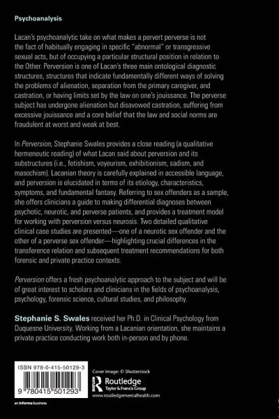 Lacan's psychoanalytic take on what makes a pervert perverse is not the fact of habitually engaging in specific "abnormal" or transgressive sexual acts, but of occupying a particular structural position in relation to the Other. Perversion is one of Lacan's three main ontological diagnostic structures, structures that indicate fundamentally different ways of solving the problems of alienation, separation from the primary caregiver, and castration, or having limits set by the law on one's jouissance. The perverse subject has undergone alienation but disavowed castration, suffering from excessive jouissance and a core belief that the law and social norms are fraudulent at worst and weak at best. In Perversion, Stephanie Swales provides a close reading (a qualitative hermeneutic reading) of what Lacan said about perversion and its substructures (i.e., fetishism, voyeurism, exhibitionism, sadism, and masochism). Lacanian theory is carefully explained in accessible language, and perversion is elucidated in terms of its etiology, characteristics, symptoms, and fundamental fantasy. Referring to sex offenders as a sample, she offers clinicians a guide to making differential diagnoses between psychotic, neurotic, and perverse patients, and provides a treatment model for working with perversion versus neurosis. Two detailed qualitative clinical case studies are presented-one of a neurotic sex offender and the other of a perverse sex offender-highlighting crucial differences in the transference relation and subsequent treatment recommendations for both forensic and private practice contexts. Perversion offers a fresh psychoanalytic approach to the subject and will be of great interest to scholars and clinicians in the fields of psychoanalysis, psychology, forensic science, cultural studies, and philosophy.