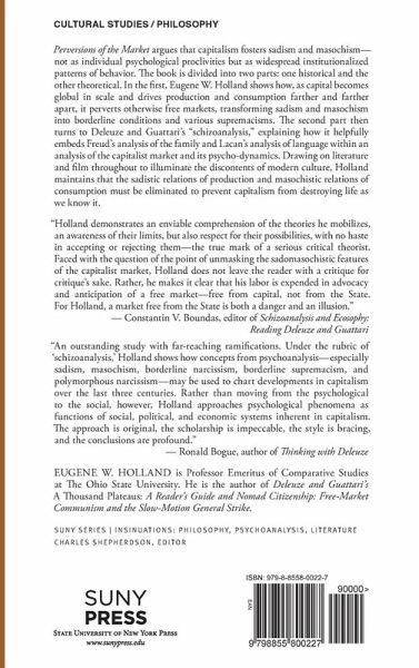 Perversions of the Market argues that capitalism fosters sadism and masochism-not as individual psychological proclivities but as widespread institutionalized patterns of behavior. The book is divided into two parts: one historical and the other theoretical. In the first, Eugene W. Holland shows how, as capital becomes global in scale and drives production and consumption farther and farther apart, it perverts otherwise free markets, transforming sadism and masochism into borderline conditions and various supremacisms. The second part then turns to Deleuze and Guattari's "schizoanalysis," explaining how it helpfully embeds Freud's analysis of the family and Lacan's analysis of language within an analysis of the capitalist market and its psycho-dynamics. Drawing on literature and film throughout to illuminate the discontents of modern culture, Holland maintains that the sadistic relations of production and masochistic relations of consumption must be eliminated to prevent capitalism from destroying life as we know it.