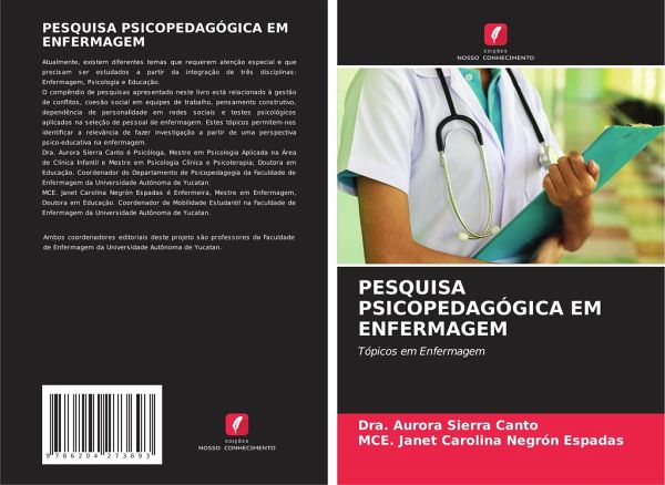 Atualmente, existem diferentes temas que requerem atenção especial e que precisam ser estudados a partir da integração de três disciplinas: Enfermagem, Psicologia e Educação. O compêndio de pesquisas apresentado neste livro está relacionado à gestão de conflitos, coesão social em equipes de trabalho, pensamento construtivo, dependência de personalidade em redes sociais e testes psicológicos aplicados na seleção de pessoal de enfermagem. Estes tópicos permitem-nos identificar a relevância de fazer investigação a partir de uma perspectiva psico-educativa na enfermagem. Dra. Aurora Sierra Canto é Psicóloga, Mestre em Psicologia Aplicada na Área de Clínica Infantil e Mestre em Psicologia Clínica e Psicoterapia; Doutora em Educação. Coordenador do Departamento de Psicopedagogia da Faculdade de Enfermagem da Universidade Autónoma de Yucatan. MCE. Janet Carolina Negrón Espadas é Enfermeira, Mestre em Enfermagem, Doutora em Educação. Coordenador de Mobilidade Estudantil na Faculdade de Enfermagem da Universidade Autônoma de Yucatan.