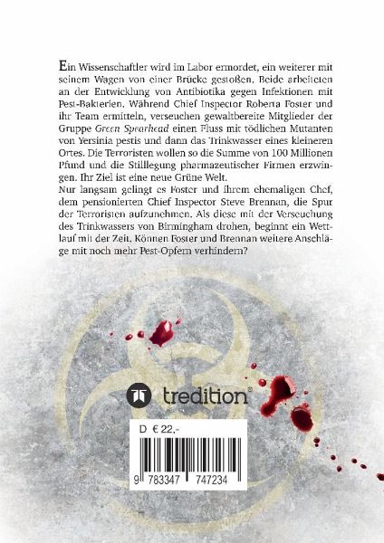 Ein Wissenschaftler wird im Labor ermordet, ein weiterer mit seinem Wagen von einer Brücke gestoßen. Beide arbeiteten an der Entwicklung von Antibiotika gegen Infektionen mit Pest-Bakterien. Während Chief Inspector Roberta Foster und ihr Team ermitteln, verseuchen gewaltbereite Mitglieder der Gruppe Green Spearhead einen Fluss mit tödlichen Mutanten von Yersinia pestis und dann das Trinkwasser eines kleineren Ortes. Die Terroristen wollen so die Summe von 100 Millionen Pfund und die Stilllegung pharmazeutischer Firmen erzwingen. Ihr Ziel ist eine neue Grüne Welt. Nur langsam gelingt es Foster…mehr