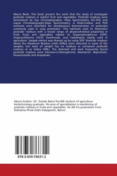 About Book: This book present the work that the study of investigate pesticide residues in market fruit and vegetables. Pesticide residues were determined by Gas Chromatography- Mass Spectrometry (GC-MS) and Liquid Chromatography-Mass Spectrometry. A Multi-residue and PGR methods were described for simultaneous determination of pesticides commonly used in crop protection. This methods used to determine pesticide residues with a broad range of physicochemical properties in fresh fruits and vegetables related to Organophosphorus (OPP), Organochlorines (OCP), Pyrethroids, and Carbamates mainly used in agriculture. Sample extract was cleaned up by using SOP. Pesticide residues above the Maximum Residue Limits (MRLs) were detected in some of the samples, but most of sample has no residues or contained pesticide residues at or below MRLs. The detected and most frequently found pesticide residues were 4-bromo-2-chlorophenol, Abamectin, Buprofezin, Hexaconazole and Acepahate.