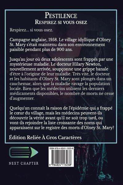 Respirez... si vous osez. Campagne anglaise, 1958. Le village idyllique d'Olney St. Mary s'était maintenu dans son environnement paisible pendant plus de 900 ans. Jusqu'au jour où deux adolescents sont frappés par une mystérieuse maladie. Le docteur Hilary Newton, nouvellement arrivée, soupçonne une grippe banale d'être à l'origine de leur maladie. Très vite, le docteur et les habitants d'Olney St. Mary sont plongés dans un cauchemar, alors que la maladie ravage la population locale. Bien que les médecins utilisent les derniers médicaments disponibles, le nombre de morts ne cesse d'augmenter. Quelqu'un connaît la raison de l'épidémie qui a frappé le c¿ur du village, mais les médecins peuvent-ils découvrir la vérité avant qu'il ne soit trop tard, ou vont-ils rejoindre la liste croissante des noms qui apparaissent sur le registre des morts d'Olney St. Mary? Il s'agit de l'édition en gros caractères de Pestilence - Respirez si vous osez, avec une police de caractères plus grande pour faciliter la lecture.