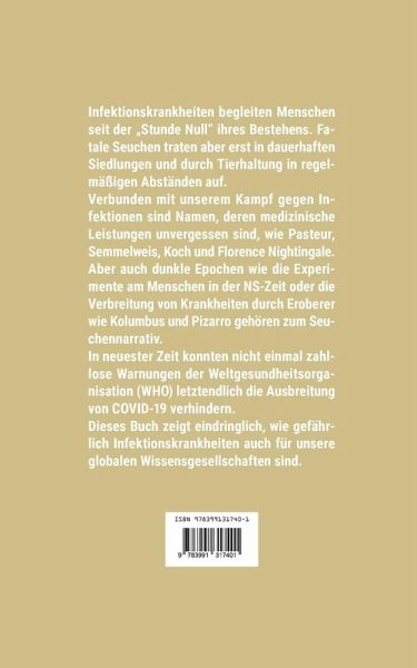 Infektionskrankheiten begleiten Menschen seit der "Stunde Null" ihres Bestehens. Fatale Seuchen traten aber erst in dauerhaften Siedlungen und durch Tierhaltung in regelmäßigen Abständen auf.Verbunden mit unserem Kampf gegen Infektionen sind Namen, deren medizinische Leistungen unvergessen sind, wie Pasteur, Semmelweis, Koch und Florence Nightingale. Aber auch dunkle Epochen wie die Experimente am Menschen in der NS-Zeit oder die Verbreitung von Krankheiten durch Eroberer wie Kolumbus und Pizarro gehören zum Seuchennarrativ.In neuester Zeit konnten nicht einmal zahllose Warnungen der Weltgesundheitsorganisation (WHO) letztendlich die Ausbreitung von COVID 19 verhindern.Dieses Buch zeigt eindringlich, wie gefährlich Infektionskrankheiten auch für unsere globalen Wissensgesellschaften sind.