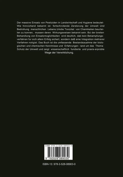 I Einführung.- II Chemische Konstitution und biologische Wirkung.- 1 Allgemeine Grundlagen.- 2 Antagonismus im Stoffwechselgeschehen.- 3 Detoxifikationsmechanismen.- III Grundlagen der Prüfung von Pestiziden auf ihre Toxizität.- 1 Verschiedene Prüfmethoden.- 2 Vergiftungserscheinungen und Vergiftungsverlauf.- IV Methoden der Applikation im Laboratorium.- 1 Topikale Applikation und Injektion.- 2 Begiftung durch Verfüttern und Tränken.- 3 Tauchmethoden.- 4 Kontaktbegiftung mittels insektizider Filme.- 5 Verwendung von Sprüh türmen.- 6 Stäubetechnik.- 7 Untersuchung von Räuchergiften.- 8 Bewertung von Begiftungsversuchen.- 9 Auswahl der Versuchstiere.- 10 Beziehung zwischen Giftdosis und Wirkung.- 11 Bedeutung des Mittlermediums.- V Zubereitungs- und Anwendungsmethoden im Freiland.- 1 Stäubemittel.- 2 Spritzmittel.- 3 Aerosole.- VI Synergismus und Antagonismus.- VII Wichtige Umweltpestizide und ihre Wirkungsweisen.- 1 Toxisch wirkende Gase.- 2 Mineralöle, Teeröle und Detergentien.- 3 Anorganische Salze.- 4 Organische Nitro-Verbindungen.- 5 Phenothiazin und verwandte Verbindungen.- 6 Nikotin und verwandte Basen.- 7 Rotenoide.- 8 Pyrethrine, Allethrine und Pyrethroide.- 9 Organische Thiocyanate.- 10 Chlorierte Kohlenwasserstoffe.- 11 Organische Phosphorsäureester.- 12 Karbamate (Urethane).- 13 Thiokarbamate und Dithiokarbamate.- 14 Phthalimide.- 15 Triazine und Triazole.- 16 Benzimidazole, Sulfamide und Phenoxysäuren.- 17 Cumarin-Derivate.- VIII Selektivität und Resistenz.- 1 Selektive Toxizität.- 2 Pestizidresistenz.- IX Toxikologie der Pestizide.- 1 Teratogene, mutagene und karzinogene Wirkungen.- 2 Wechselwirkungen mit ümweltfaktoren.- X Umwelttoxikologie.- 1 Pestizidrückstände.- 2 Nahrungsketten - Nahrungsnetze; Akkumulation.- 3 Biotransformationvon Pestiziden in der Umwelt.- 4 Transformationen durch abiotische Faktoren.- 5 Berufskrankheiten.- 6 Fehleinsatz von Pestiziden.- 7 Streusalzschäden.- XI Umweltschonende Verfahren (Alternativen).- 1 Nutzung natürlicher Abwehrstoffe.- 2 Pflanzliche Attraktivstoffe und Phagostimulantien.- 3 Methoden der Sterilisierung (Autozidverfahren).- 4 Färb-und Lichtfallen.- 5 Wachstumsregulatoren.- 6 Einsatz von Pheromonen.- 7 Suppressoren und Antibiotika.- 8 Königinnentechnik.- XII Biologische Schädlingsbekämpfung als ein Weg zum Umweltschutz.- 1 Einsatz von Wirbeltieren.- 2 Verwendung von Arthropoden.- 3 Verwendung von Planarien und Nematoden.- 4 Mikrobiologische Bekämpfungsmaßnahmen.- XIII Integrierter Pflanzen- und Gesundheitsschutz als Umweltschutz.- 1 Definitionen.- 2 Wirtschaftliche und hygienische Schadensschwellen.- 3 Auswahl der Methoden.- 4 Erarbeitung integrierter Programme.- 5 Ein Blick in die Zukunft.- Literatur.- Verzeichnis wissenschaftlicher Namen.