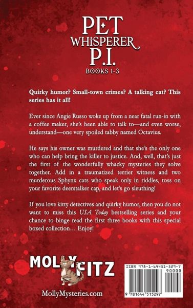 Quirky humor? Small-town crimes? A talking cat? This series has it all! Ever since Angie Russo woke up from a near fatal run-in with a coffee maker, she's been able to talk to-and even worse, understand-one very spoiled tabby named Octavius. This collection includes Dog-Eared Delinquent, The Cat Caper,andChihuahua Conspiracy. Read along as Angie discovers the source of her strange power... and promptly forgets it again. Add in an unwanted blast from Octo-Cat's past and a trouble-making new fur baby, toss on your favorite deerstalker cap, and let's go sleuthing! If you love kitty detectives and quirky humor, then you do not want to miss this USA Today bestselling series and your chance to binge read books four through six with this special boxed collection... Enjoy!