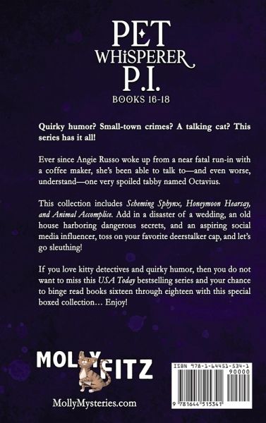 Ever since Angie Russo woke up from a near fatal run-in with a coffee maker, she's been able to talk to-and even worse, understand-one very spoiled tabby named Octavius. This collection includes Scheming Sphynx, Honeymoon Hearsay, and Animal Accomplice. Add in a disaster of a wedding, an old house harboring dangerous secrets, and an aspiring social media influencer, toss on your favorite deerstalker cap, and let's go sleuthing! If you love kitty detectives and quirky humor, then you do not want to miss this USA Today bestselling series and your chance to binge read books sixteen through eighteen with this special boxed collection... Enjoy!
