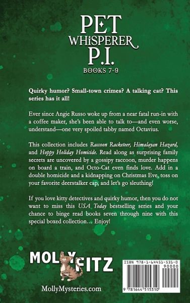 Quirky humor? Small-town crimes? A talking cat? This series has it all! Ever since Angie Russo woke up from a near fatal run-in with a coffee maker, she's been able to talk to-and even worse, understand-one very spoiled tabby named Octavius. This collection includes Raccoon Racketeer, Himalayan Hazard, and Hoppy Holiday Homicide. Read along as surprising family secrets are uncovered by a gossipy raccoon, murder happens on board a train, and Octo-Cat even finds love. Add in a double homicide and a kidnapping on Christmas Eve, toss on your favorite deerstalker cap, and let's go sleuthing! If you love kitty detectives and quirky humor, then you do not want to miss this USA Today bestselling series and your chance to binge read books seven through nine with this special boxed collection... Enjoy!