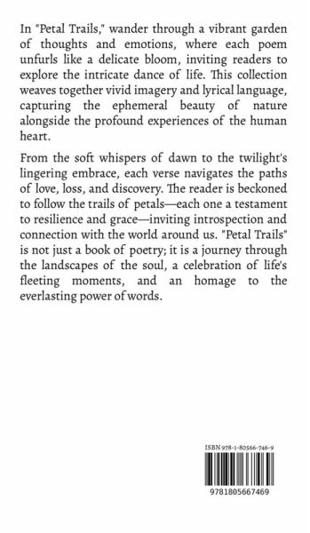 In "Petal Trails," wander through a vibrant garden of thoughts and emotions, where each poem unfurls like a delicate bloom, inviting readers to explore the intricate dance of life. This collection weaves together vivid imagery and lyrical language, capturing the ephemeral beauty of nature alongside the profound experiences of the human heart. From the soft whispers of dawn to the twilight's lingering embrace, each verse navigates the paths of love, loss, and discovery. The reader is beckoned to follow the trails of petals-each one a testament to resilience and grace-inviting introspection and connection with the world around us. "Petal Trails" is not just a book of poetry; it is a journey through the landscapes of the soul, a celebration of life's fleeting moments, and an homage to the everlasting power of words.