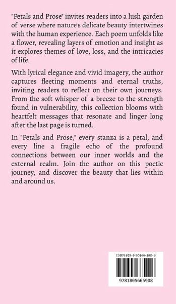 "Petals and Prose" invites readers into a lush garden of verse where nature's delicate beauty intertwines with the human experience. Each poem unfolds like a flower, revealing layers of emotion and insight as it explores themes of love, loss, and the intricacies of life. With lyrical elegance and vivid imagery, the author captures fleeting moments and eternal truths, inviting readers to reflect on their own journeys. From the soft whisper of a breeze to the strength found in vulnerability, this collection blooms with heartfelt messages that resonate and linger long after the last page is turned. In "Petals and Prose," every stanza is a petal, and every line a fragile echo of the profound connections between our inner worlds and the external realm. Join the author on this poetic journey, and discover the beauty that lies within and around us.